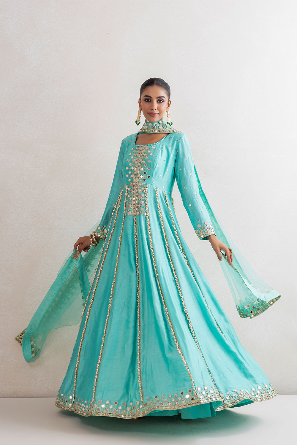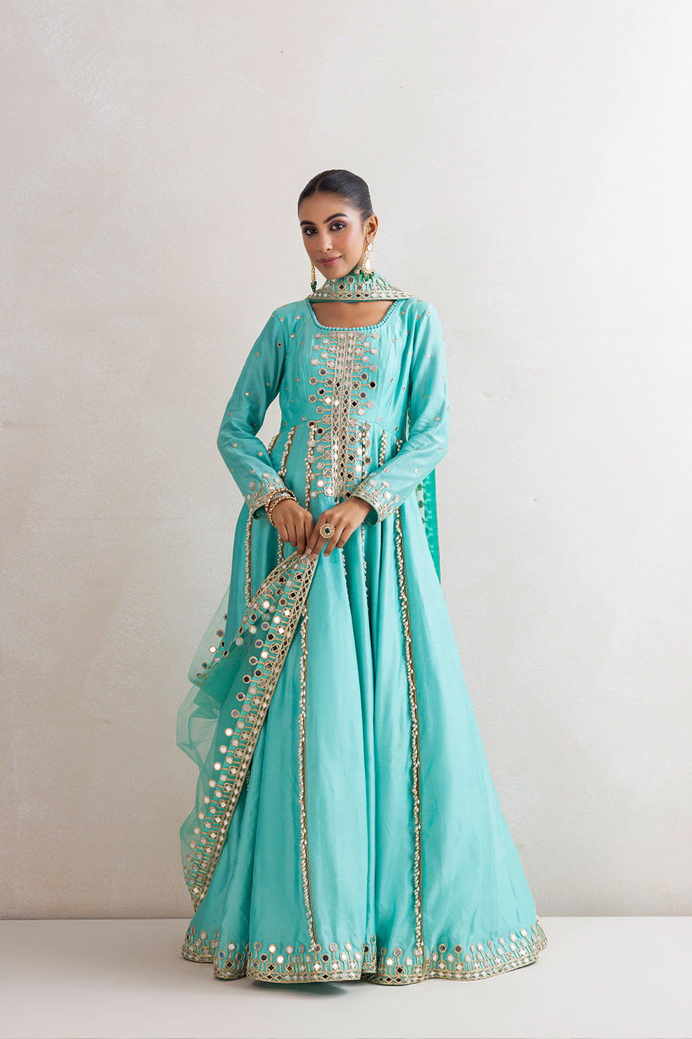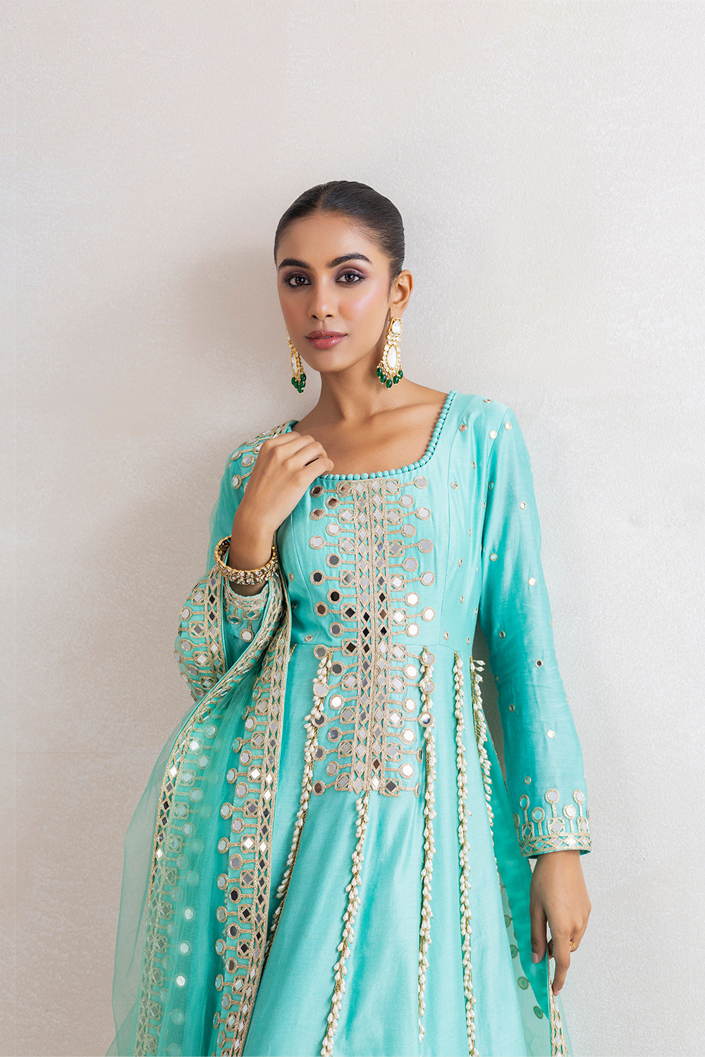 Silk Chanderi floor length anarkali with beading lace detailing on the yoke, sleeves and kalis, aari work on the yoke. Embroidered border on the hemline. Net dupatta with scallop lace details.