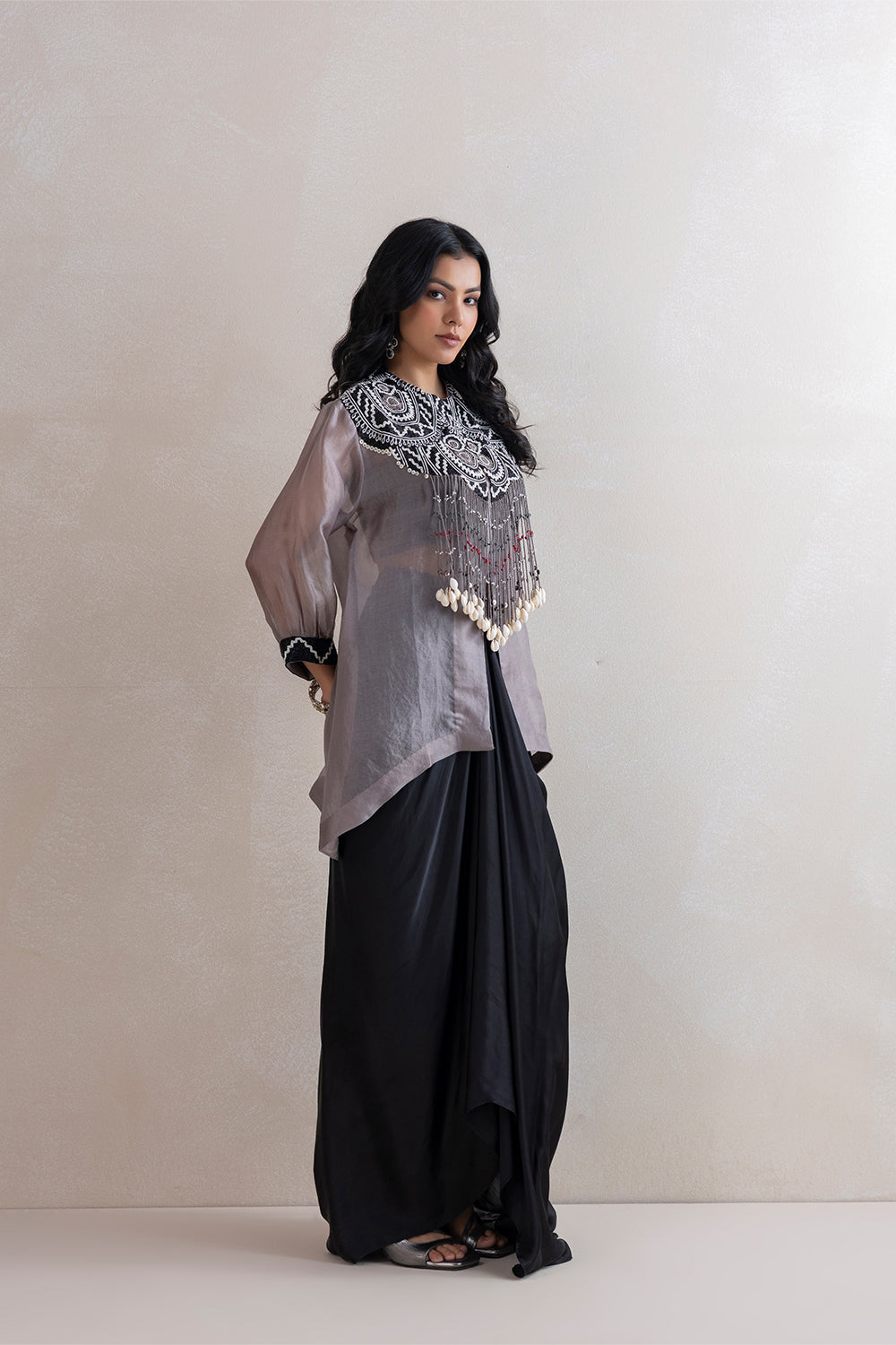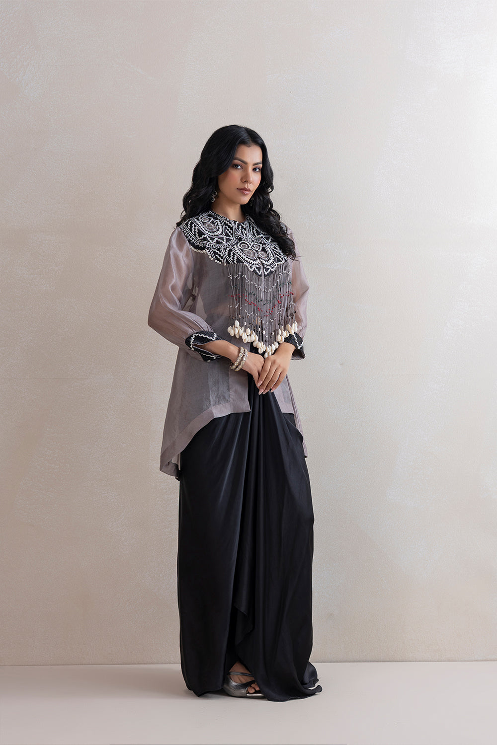 FABRIC: Oragzana Shirt, Satin Dhoti and Bustier